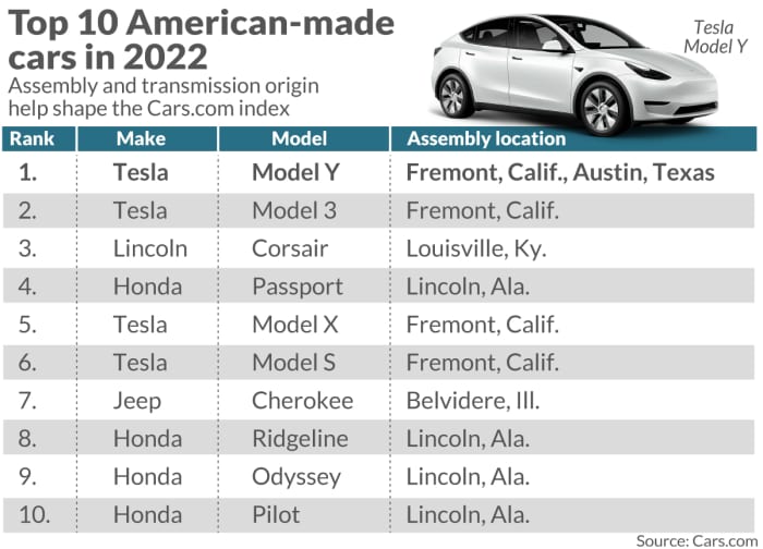 One Tesla model topped another to rank as the most “American-made” vehicle for 2022 in this long-running index that judges contenders based their U.S.-based assembly line, major parts sourcing and other features.